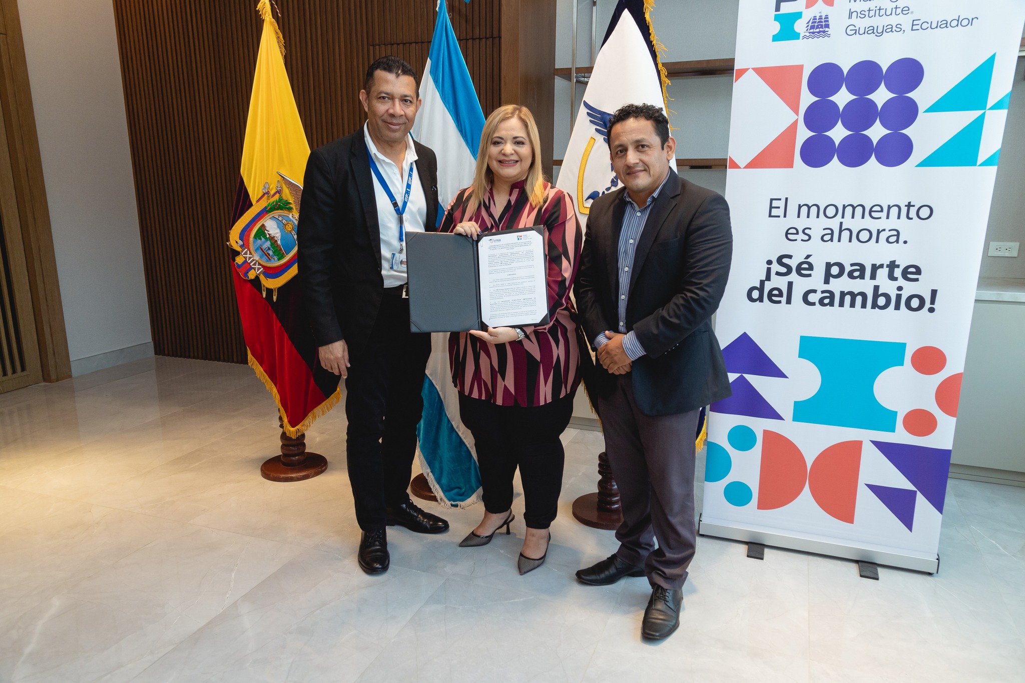 Participaron en la suscripción del convenio, el MSc. José Portocarrera, presidente de PMI Guayas y la Dra. Mara Cabanilla, rectora de nuestra institución.