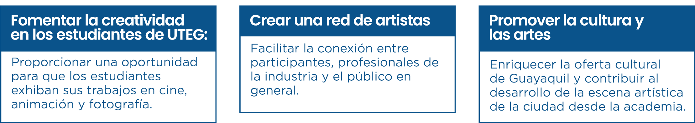 Enriquecer la oferta cultural de Guayaquil y contribuir al desarrollo de la escena artística de la ciudad desde la academia.